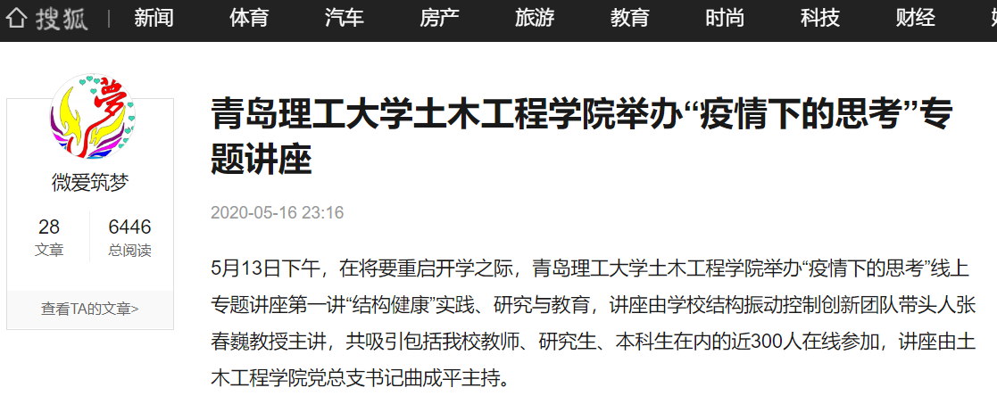 5月13日下午,在将要重启开学之际,365完美体育土木工程学院举办“疫情下的思考”线上专题讲座第一讲“结构健康”实践、研究与教育,讲座由学校结构振动控制创新团队带头人张春巍教授主讲,共吸引包括365完美教师、研究生、本科生在内的近300人在线参加,讲座由土木工程学院党总支书记曲成平主持。
