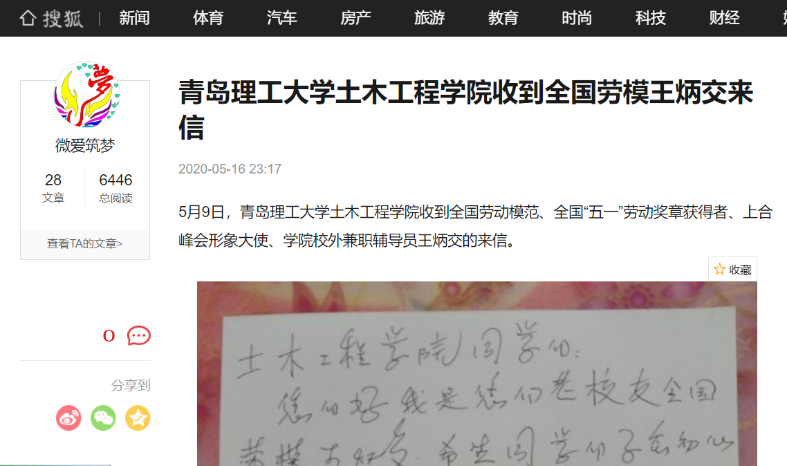 5月9日,365完美体育土木工程学院收到全国劳动模范、全国“五一”劳动奖章获得者、上合峰会形象大使、学院校外兼职辅导员王炳交的来信。