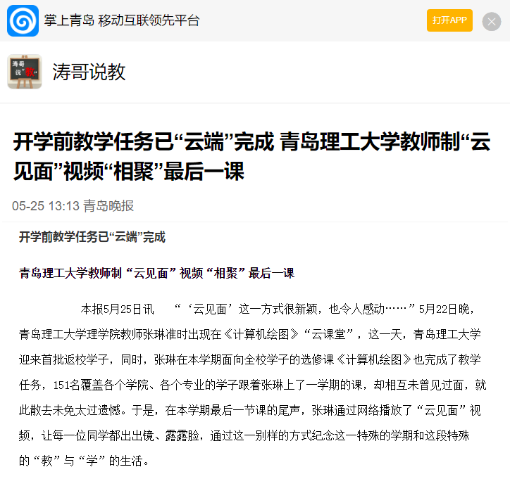 记者了解到,虽然驻青高校正陆续、分批、有序开学,但不少选修课已经通过“云课堂”结课或即将结课,教师和同学们虽然未曾真正谋面,却通过团结努力,保质保量地共同完成了本学期某一课程的教与学的任务。