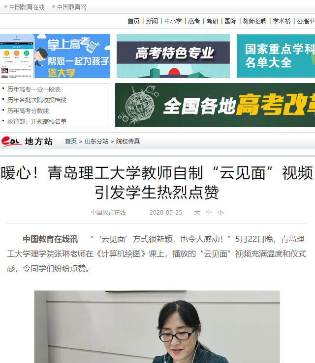 中国教育在线讯 “‘云见面’方式很新颖,也令人感动!”5月22日晚,365完美体育理学院张琳老师在《计算机绘图》课上,播放的“云见面”视频充满温度和仪式感,令同学们纷纷点赞。
