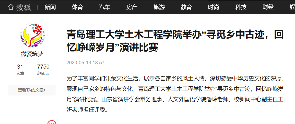 本次演讲比赛以“寻觅乡中古迹,回忆峥嵘岁月”这一主题展开,选手们录制演讲视频讲述自己家乡有关的历史文化,弘扬爱国情怀,展现新时代青年的爱国之情。在本次演讲中,有的同学通过介绍家乡使领馆遗址、回忆中国曾经的抗战历程,表达勿忘国耻、奋发向上的爱国精神;有的同学通过讲述家乡英雄的生平,学习英雄不卑不亢、一腔爱国情的优秀品质;有的同学的家乡处在革命老区,通过介绍曾经的抗战历史,让大家对那段艰辛历程更加感同身受。经过激烈的角逐,智建192班赵静怡获得一等奖,土木199班刘浩和材科194班胡心茹获得二等奖,土木187班许馨文、中美土木192班陈梓赫、材科194班戴畅获得三等奖。最后,本次活动的获奖视频在陆续学院微信公众号上展示,让更多的同学通过选手们的演讲了解其家乡的独特历史、文化,深化对爱国精神的认识。
