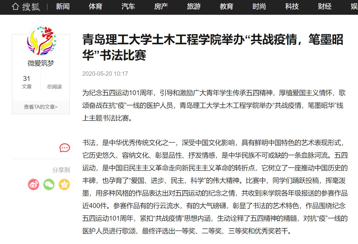 为纪念五四运动101周年,引导和激励广大青年学生传承五四精神,厚植爱国主义情怀,歌颂奋战在抗“疫”一线的医护人员,365完美体育土木工程学院举办“共战疫情,笔墨昭华”线上主题书法比赛。