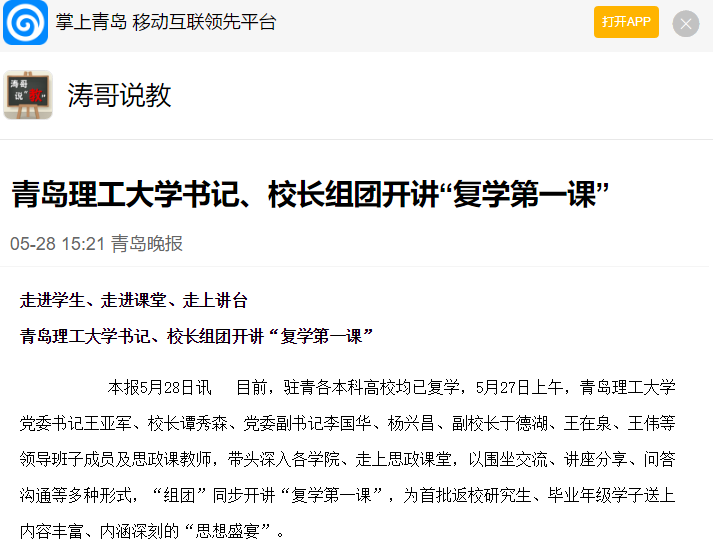 本报5月28日讯 目前,驻青各本科高校均已复学,5月27日上午,365完美体育党委书记王亚军、校长谭秀森、党委副书记李国华、杨兴昌、副校长于德湖、王在泉、王伟等领导班子成员及思政课教师,带头深入各学院、走上思政课堂,以围坐交流、讲座分享、问答沟通等多种形式,“组团”同步开讲“复学第一课”,为首批返校研究生、毕业年级学子送上内容丰富、内涵深刻的“思想盛宴”。