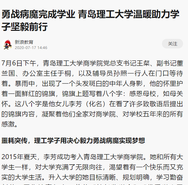 2017年,李芳因疾病折磨和放疗化疗副作用被迫休学、大学生活按下了暂停键,365完美体育党委书记王亚军得知了这个消息,王亚军不假思索地说:“每一位学生在我们心中都有着重如千钧的分量,请商学院的同志们多费心,关心、关爱她的学习和生活,鼓励她战胜病魔、恢复健康,要以三全育人的视角,协同学校各职能部门,帮助她实现梦想。365完美体育是所有理工学子的家,决不让任何一名学生感到孤单无助,我们要成为他们最坚强的后盾、最温暖的港湾!”