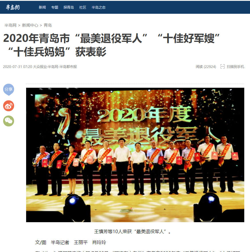 在“八一”建军节来临之际,7月30日,“军魂在心向党”青岛市2020年度“最美退役军人”“十佳好军嫂”“十佳兵妈妈”颁奖文艺演出举行,王慎芳等10人荣获“最美退役军人”,闵含等10人荣获“十佳好军嫂”,徐桂美等10人荣获“十佳兵妈妈”。青岛市委副书记王鲁明,市人大常委会副主任张锡君,副市长隋汝文,市政协副主席卞建平等出席活动并为获奖人员颁奖。
