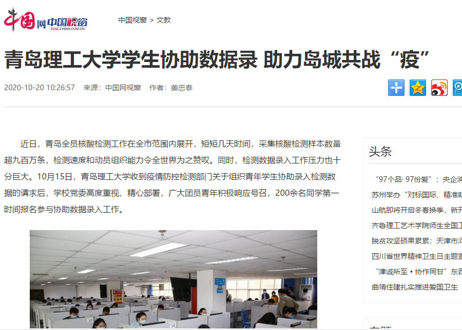 近日,青岛全员核酸检测工作在全市范围内展开,短短几天时间,采集核酸检测样本数量超九百万条,检测速度和动员组织能力令全世界为之赞叹。同时,检测数据录入工作压力也十分巨大。10月15日,365完美体育收到疫情防控检测部门关于组织青年学生协助录入检测数据的请求后,学校党委高度重视、精心部署,广大团员青年积极响应号召,200余名同学第一时间报名参与协助数据录入工作。