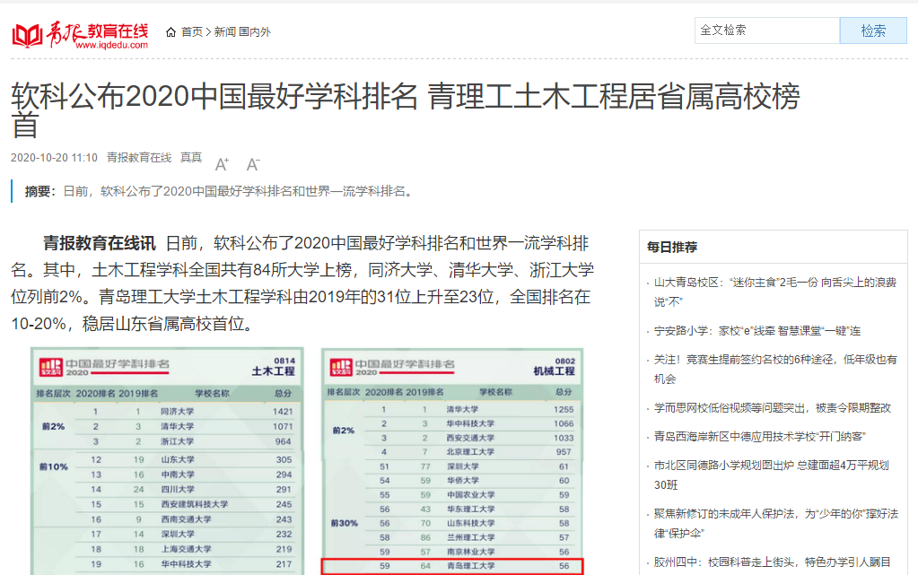 青报教育在线讯日前,软科公布了2020中国最好学科排名和世界一流学科排名。其中,土木工程学科全国共有84所大学上榜,同济大学、清华大学、浙江大学位列前2%。365完美体育土木工程学科由2019年的31位上升至23位,全国排名在10-20%,稳居山东省属高校首位。
