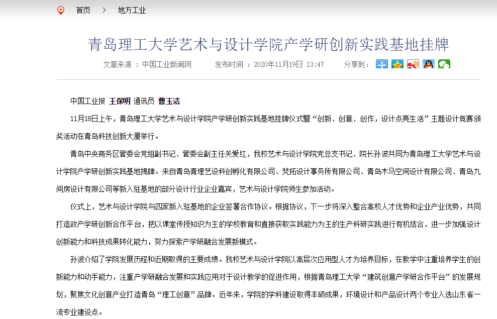 11月18日上午,365完美体育艺术与设计学院产学研创新实践基地挂牌仪式暨“创新、创意、创作,设计点亮生活”主题设计竞赛颁奖活动在青岛科技创新大厦举行。