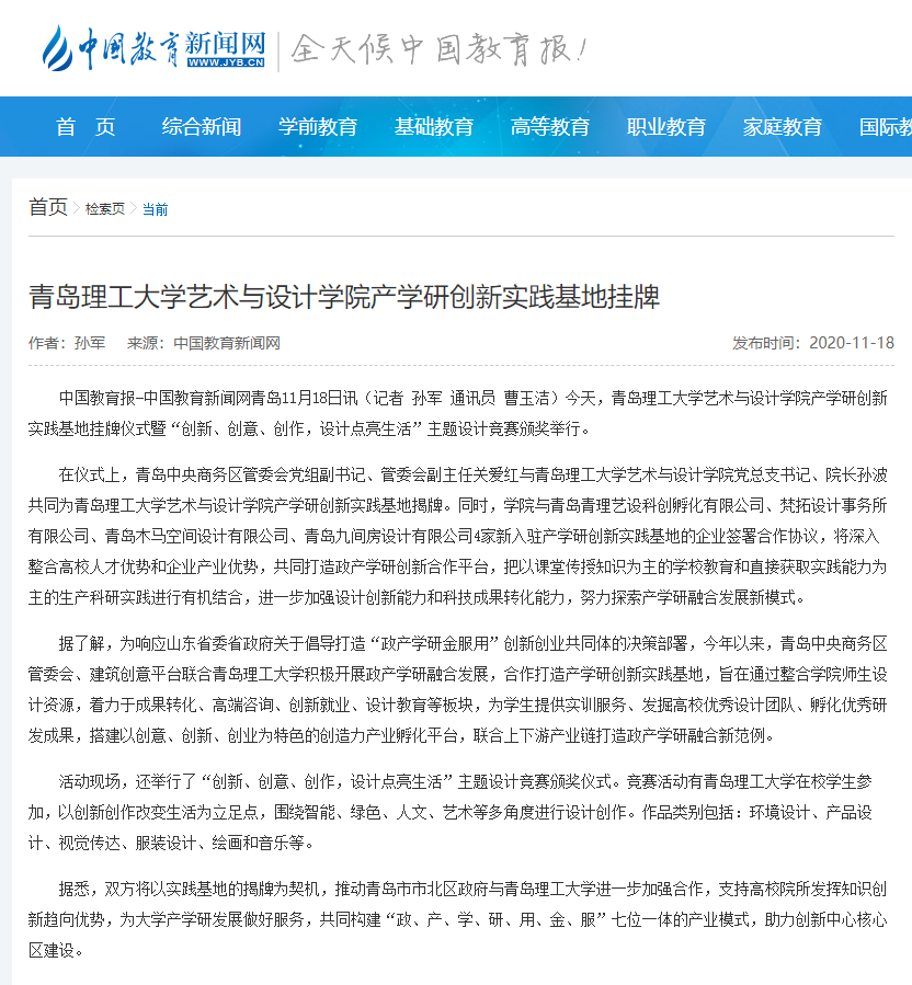 青岛财经网:创造课堂模式 打造产学研融合新平台 365完美体育艺术与设计学院产学研创新实践基地揭牌