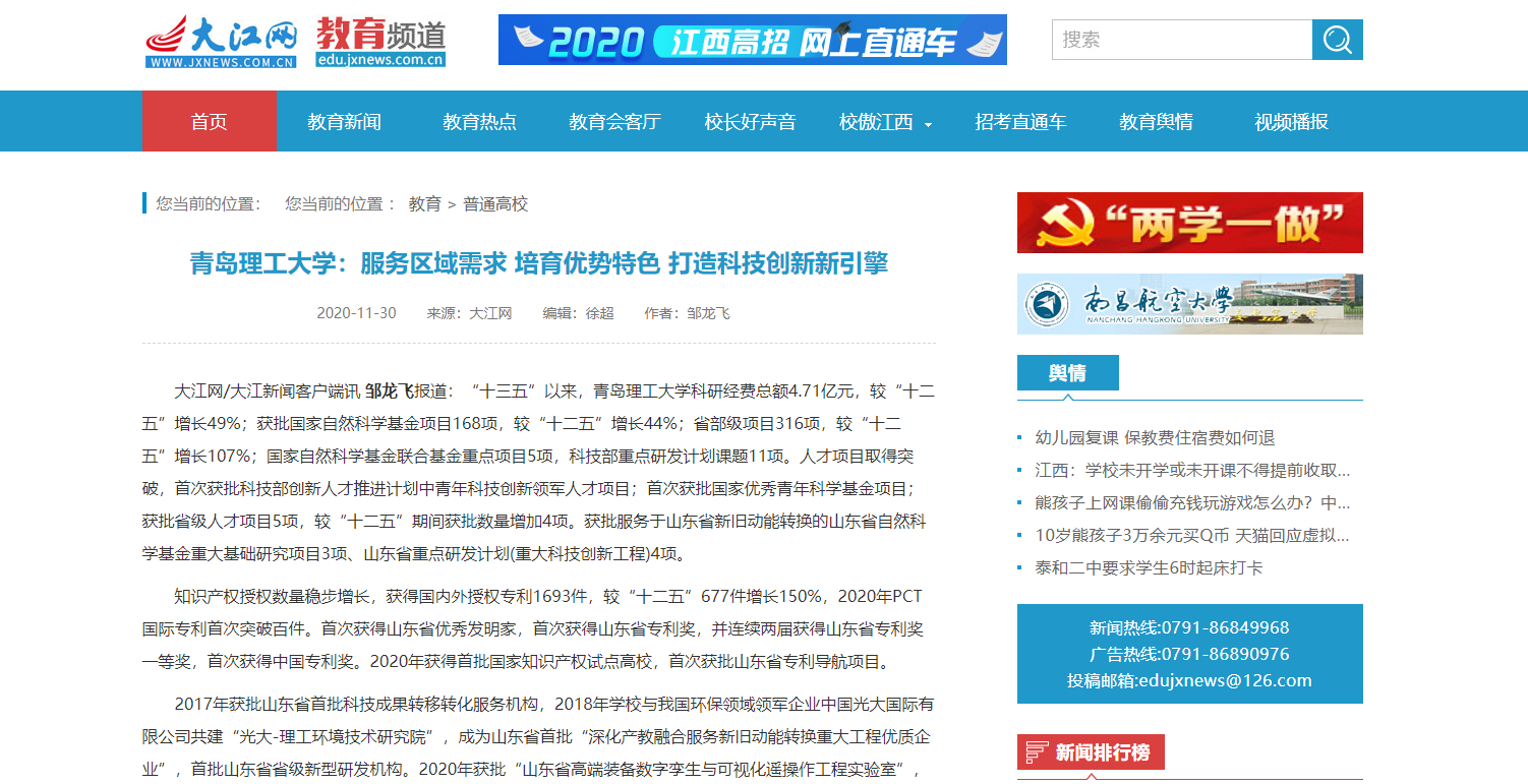 学校坚持“立足青岛、服务山东、面向全国”,着力探索校企、校地合作新模式,加快推进科教产融合,打造“区域特色+学科优势”科技创新“双引擎”,赋能科研高质量发展,为区域经济社会建设提供更多的智力、人力和技术支持。