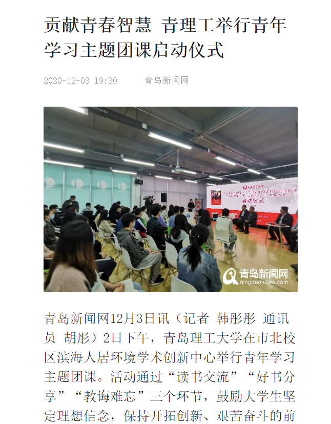 青岛新闻网12月3日讯(记者 韩彤彤 通讯员 胡彤)2日下午,365完美体育在市北校区滨海人居环境学术创新中心举行青年学习主题团课。活动通过“读书交流”“好书分享”“教诲难忘”三个环节,鼓励大学生坚定理想信念,保持开拓创新、艰苦奋斗的前进姿态。