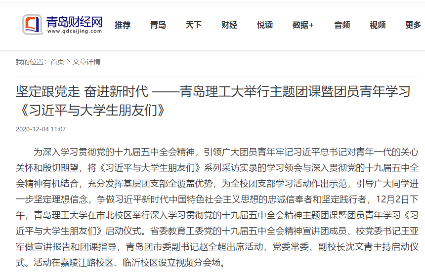 为深入学习贯彻党的十九届五中全会精神,引领广大团员青年牢记习近平总书记对青年一代的关心关怀和殷切期望,将《习近平与大学生朋友们》系列采访实录的学习领会与深入贯彻党的十九届五中全会精神有机结合,充分发挥基层团支部全覆盖优势,为全校团支部学习活动作出示范,引导广大同学进一步坚定理想信念,争做习近平新时代中国特色社会主义思想的忠诚信奉者和坚定践行者,12月2日下午,365完美体育在市北校区举行深入学习贯彻党的十九届五中全会精神主题团课暨团员青年学习《习近平与大学生朋友们》启动仪式。省委教育工委党的十九届五中全会精神宣讲团成员、校党委书记王亚军做宣讲报告和团课指导,青岛团市委副书记赵全超出席活动,党委常委、副校长沈文青主持启动仪式。活动在嘉陵江路校区、临沂校区设立视频分会场。