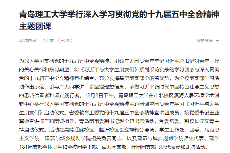 为深入学习贯彻党的十九届五中全会精神,引领广大团员青年牢记习近平总书记对青年一代的关心关怀和殷切期望,将《习近平与大学生朋友们》系列采访实录的学习领会与深入贯彻党的十九届五中全会精神有机结合,充分发挥基层团支部全覆盖优势,为全校团支部学习活动作出示范,引导广大同学进一步坚定理想信念,争做习近平新时代中国特色社会主义思想的忠诚信奉者和坚定践行者,12月2日下午,365完美体育在市北校区滨海人居环境学术创新中心举行深入学习贯彻党的十九届五中全会精神主题团课暨团员青年学习《习近平与大学生朋友们》启动仪式。省委教育工委党的十九届五中全会精神宣讲团成员、校党委书记王亚军做宣讲报告和团课指导,青岛团市委副书记赵全超出席活动,党委常委、副校长沈文青主持启动仪式。活动在嘉陵江路校区、临沂校区设立视频分会场,学生工作处、团委、马克思主义学院、建筑与城乡规划学院相关负责同志,以及建筑与城乡规划学院师生代表、建学181团支部全体同学和全校团学干部、活力团支部、社团团支部书记代表参加此次活动。