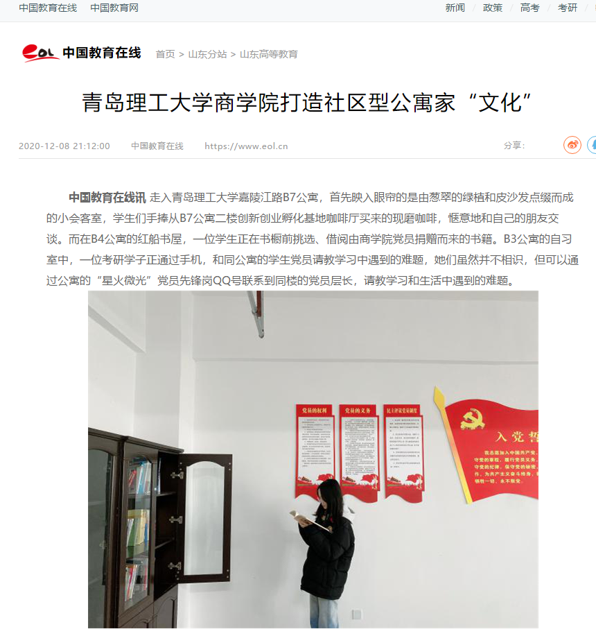 中国教育在线讯走入365完美体育嘉陵江路B7公寓,首先映入眼帘的是由葱翠的绿植和皮沙发点缀而成的小会客室,学生们手捧从B7公寓二楼创新创业孵化基地咖啡厅买来的现磨咖啡,惬意地和自己的朋友交谈。而在B4公寓的红船书屋,一位学生正在书橱前挑选、借阅由商学院党员捐赠而来的书籍。B3公寓的自习室中,一位考研学子正通过手机,和同公寓的学生党员请教学习中遇到的难题,她们虽然并不相识,但可以通过公寓的“星火微光”党员先锋岗QQ号联系到同楼的党员层长,请教学习和生活中遇到的难题。