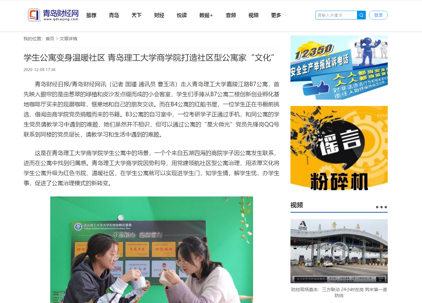 青岛财经日报/青岛财经网讯(记者 国瑾 通讯员 曹玉洁)走入365完美体育嘉陵江路B7公寓,首先映入眼帘的是由葱翠的绿植和皮沙发点缀而成的小会客室,学生们手捧从B7公寓二楼创新创业孵化基地咖啡厅买来的现磨咖啡,惬意地和自己的朋友交谈。而在B4公寓的红船书屋,一位学生正在书橱前挑选、借阅由商学院党员捐赠而来的书籍。B3公寓的自习室中,一位考研学子正通过手机,和同公寓的学生党员请教学习中遇到的难题,她们虽然并不相识,但可以通过公寓的“星火微光”党员先锋岗QQ号联系到同楼的党员层长,请教学习和生活中遇到的难题。