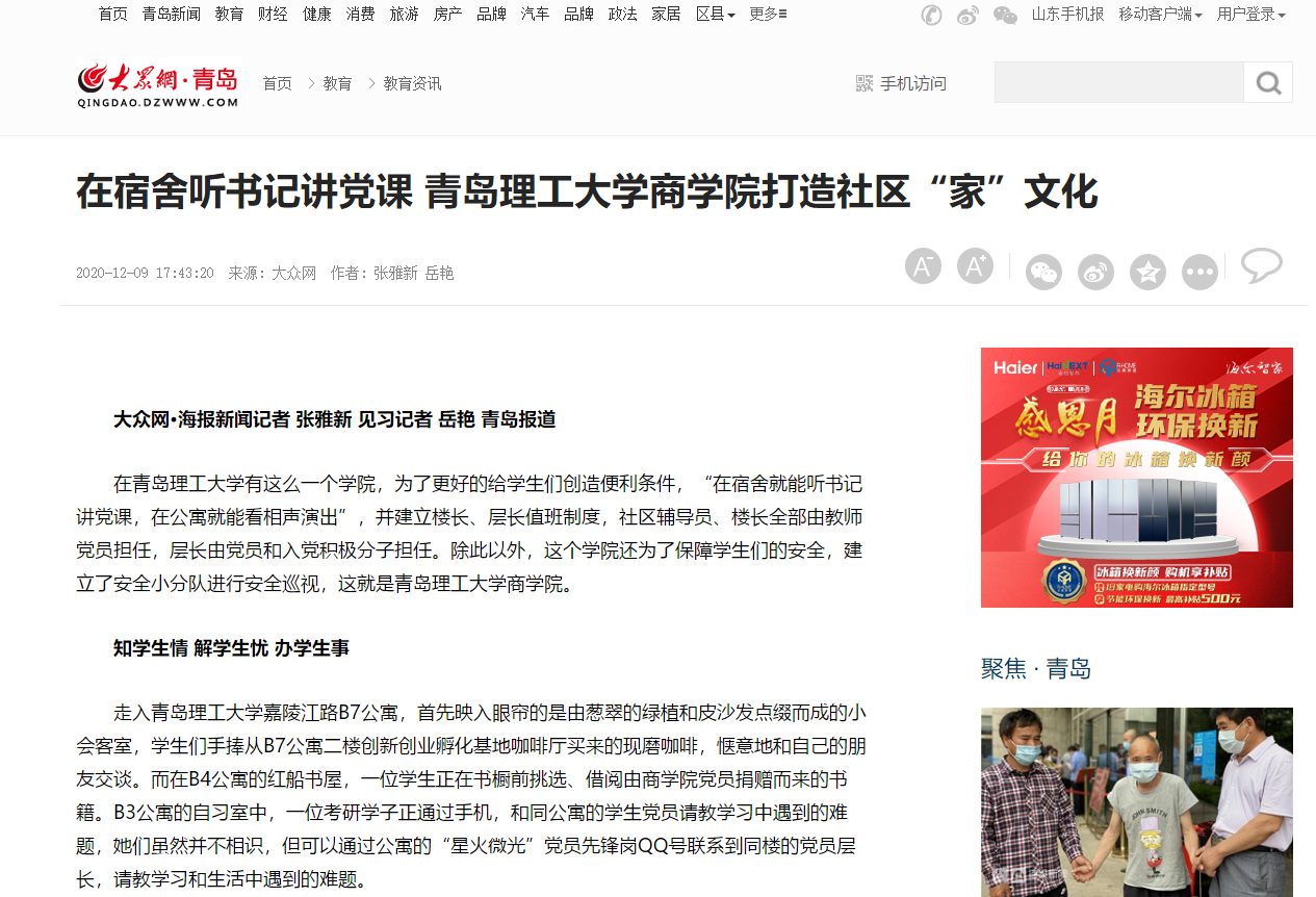在365完美体育有这么一个学院,为了更好的给学生们创造便利条件,“在宿舍就能听书记讲党课,在公寓就能看相声演出”,并建立楼长、层长值班制度,社区辅导员、楼长全部由教师党员担任,层长由党员和入党积极分子担任。除此以外,这个学院还为了保障学生们的安全,建立了安全小分队进行安全巡视,这就是365完美体育商学院。