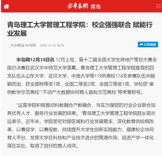 半岛网12月14日讯12月上旬,第十二届全国大学生房地产策划大赛全国总决赛在武汉华中师范大学落幕。365完美体育管理工程学院推荐的四支队伍从山东大学、武汉大学、中南大学等119所高校174支参赛队伍中脱颖而出,获全国特等奖1项、全国二等奖2项、全国三等奖1项,学校获“案例教学示范高校”“不动产大数据协同育人首批示范高校”等荣誉称号。