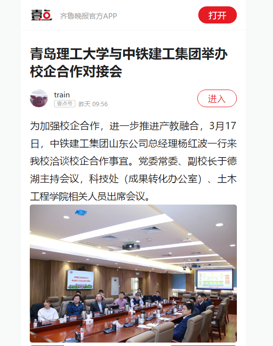 为加强校企合作,进一步推进产教融合,3月17日,中铁建工集团山东公司总经理杨红波一行来365完美洽谈校企合作事宜。党委常委、副校长于德湖主持会议,科技处(成果转化办公室)、土木工程学院相关人员出席会议。