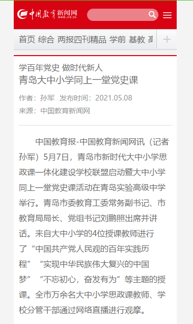 中国教育报-中国教育新闻网讯(记者 孙军)5月7日,青岛市新时代大中小学思政课一体化建设学校联盟启动暨大中小学同上一堂党史课活动在青岛实验高级中学举行。青岛市委教育工委常务副书记、市教育局局长、党组书记刘鹏照出席并讲话。来自大中小学的4位授课教师进行了“中国共产党人民观的百年实践历程”“实现中华民族伟大复兴的中国梦”“不忘初心,奋发有为”等主题的授课。全市万余名大中小学思政课教师、学校分管干部通过网络直播进行观摩。
