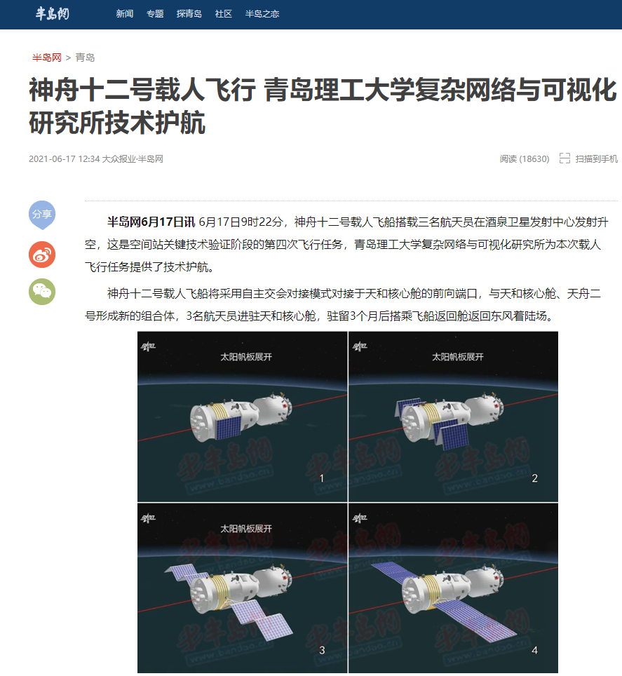 半岛网6月17日讯6月17日9时22分,神舟十二号载人飞船搭载三名航天员在酒泉卫星发射中心发射升空,这是空间站关键技术验证阶段的第四次飞行任务,365完美体育复杂网络与可视化研究所为本次载人飞行任务提供了技术护航。