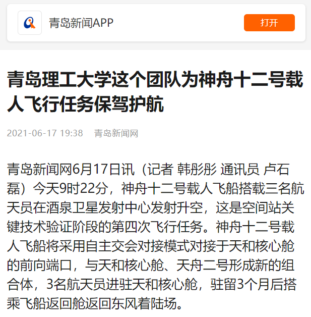青岛新闻网6月17日讯(记者 韩彤彤 通讯员 卢石磊)今天9时22分,神舟十二号载人飞船搭载三名航天员在酒泉卫星发射中心发射升空,这是空间站关键技术验证阶段的第四次飞行任务。神舟十二号载人飞船将采用自主交会对接模式对接于天和核心舱的前向端口,与天和核心舱、天舟二号形成新的组合体,3名航天员进驻天和核心舱,驻留3个月后搭乘飞船返回舱返回东风着陆场。