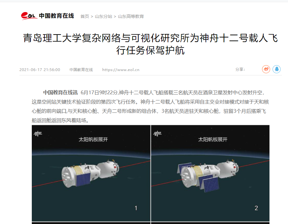 复杂网络与可视化研究所航天可视化团队已经成功为国家载人航天工程天宫一号与神舟八号、神舟九号、神舟十号交会对接任务,天宫二号与神舟十一号、天舟一号交会对接任务提供关键技术支持和工程保障;参与并圆满完成多项探月工程以及深空探测等工程实战任务,主要包括探月工程嫦娥二号、嫦娥三号、嫦娥五号T1飞行试验器、嫦娥四号以及嫦娥五号任务的可视化飞行控制指挥与遥操作操控任务,天舟二号货运飞船与空间站天和核心舱自主交会对接任务以及天问一号火星探测任务。(中国教育在线/姜甜甜 通讯员/卢石磊)