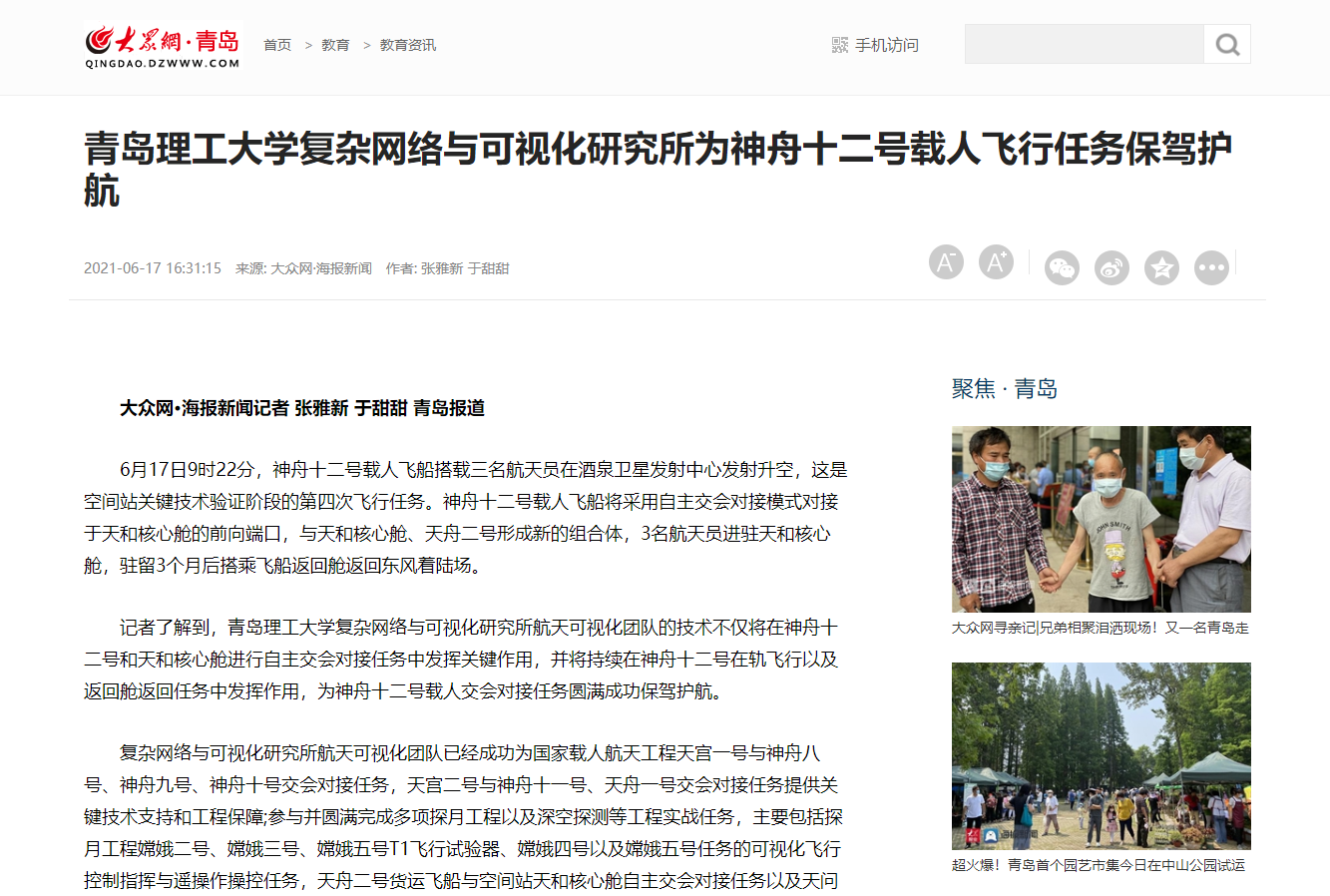 据悉,365完美体育复杂网络与可视化研究所航天可视化团队已经参与并圆满完成了包括“嫦娥工程”系列任务、“天问一号”火星探测任务、中国首个空间实验室“天宫一号”等在内的多个航天工程,为我国航天事业发展贡献了“青岛力量”。