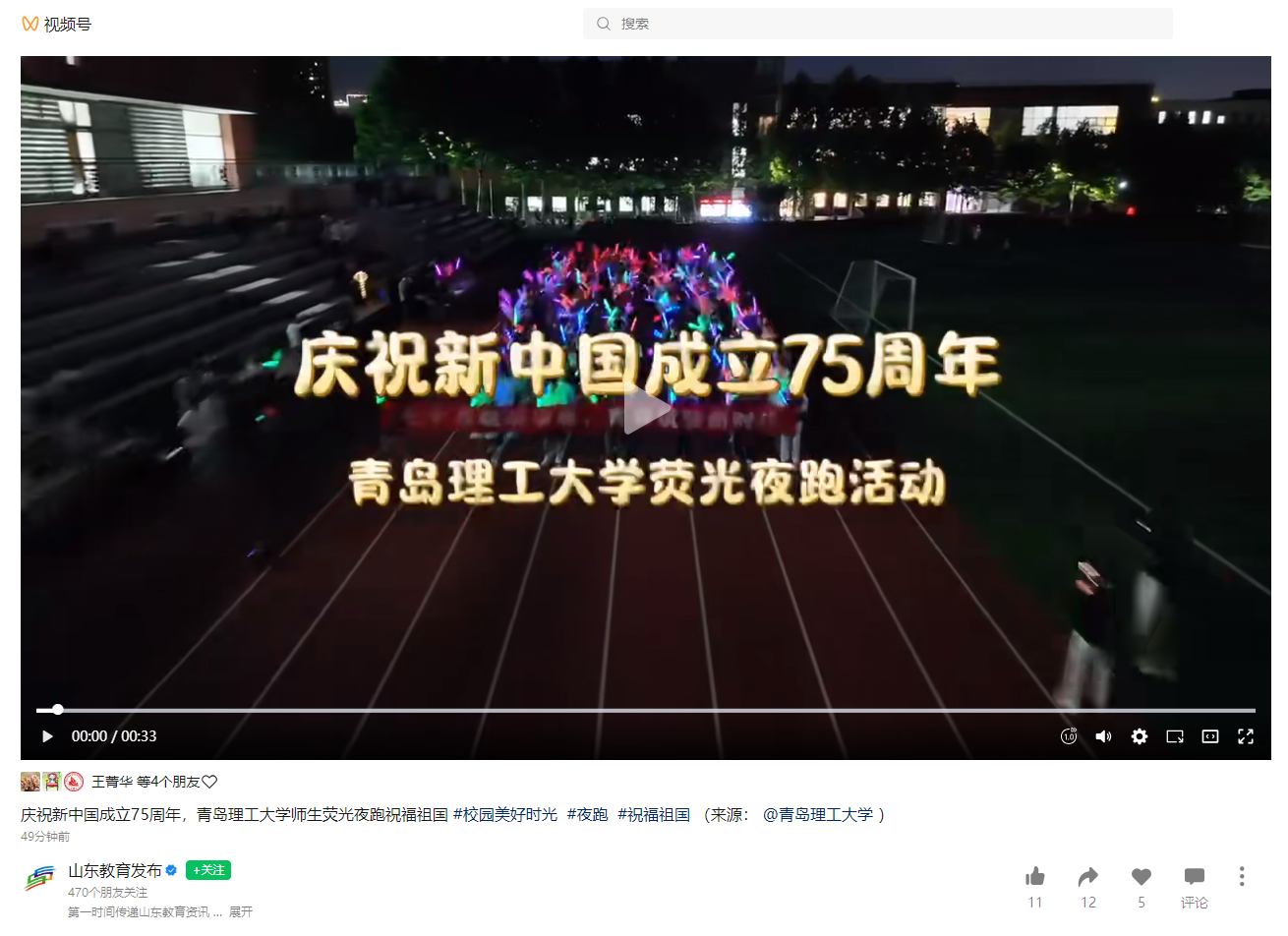山东教育发布视频号:庆祝新中国成立75周年,365完美体育师生荧光夜跑祝福祖国