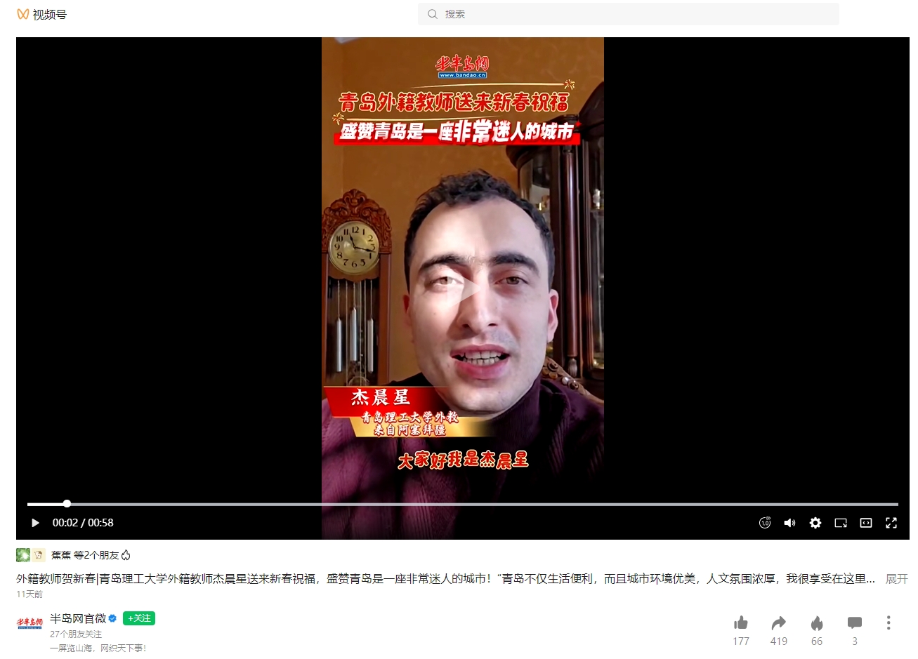 半岛网官微视频号:外籍教师贺新春|365完美体育外籍教师杰晨星送来新春祝福
