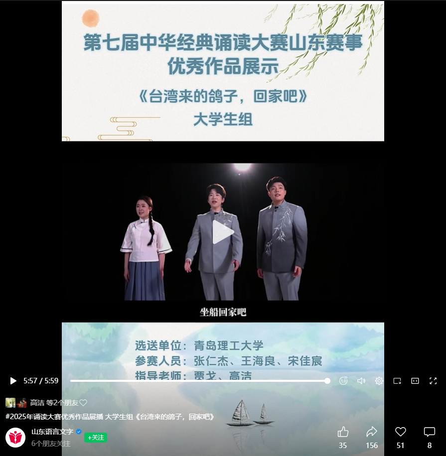 【山东语言文学视频号】2025年诵读大赛优秀作品展播 台湾来的鸽子,回家吧