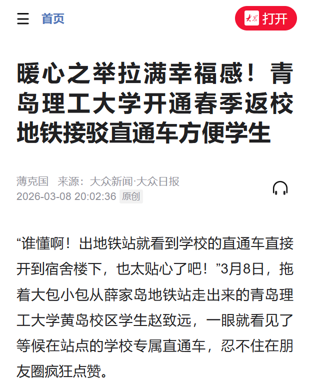 从地铁口到宿舍楼,这波操作看似简单,却戳中了返校学子最柔软的神经。人文与外国语学院学生辛晓飞下车后开心地说:“从薛家岛地铁站直达校内公寓的直通车,彻底解决了我们拖着沉重行李换乘不便的难题。从地铁口到宿舍楼下一站式接送,既安全又便捷,让我们真切感受到学校的用心与温暖,为学校这份暖心之举点赞!”