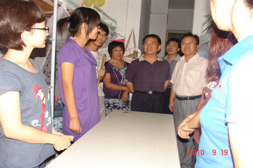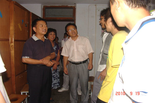 宿舍里,气氛活跃,学校领导与新生进行了详细的交流沟通,深入了解了新生的食宿情况,以及他们对新的生活环境的适应度,并嘱咐他们在以后的军训与学习中,要配合好学校的各项工作安排,努力尽快的融入新的生活、学习环境,搞好同学内部的团结,平常在生活学习上遇到困难要及时向学院、老师寻求帮助。2010级新生也向学院领导询问了一些关于学校生活的问题,并得到了老师的详尽回答。