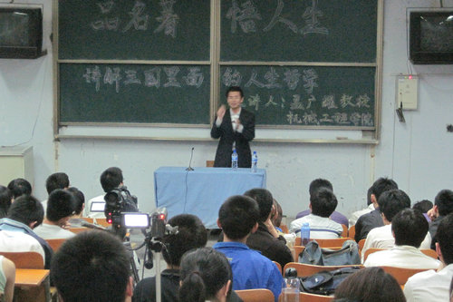 孟广耀教授通过三国里的典型人物,联系生活实际,幽默之中映射深刻的人生哲理,哲思中透漏乐趣,乐趣中寻找生活的指导。此次讲座旨在通过三国中的典型人物,感受人生的真谛,培养提高我们的文学修养,提高我们的文学素质,进而更好的指导我们前进。(机械学院 于伟伟)