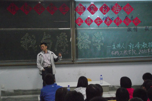 讲座在同学们热烈的掌声中结束。郭峰教授结合自身情况与学生实际进行的一番讲座,使同学们受益匪浅,为同学们确定人生目标与方向以及如何充实而有意义的度过大学生活指明了方向。此次讲座对于繁荣校园文化,促进校园文化发展具有积极的意义。(机械学院 宿忠旭)