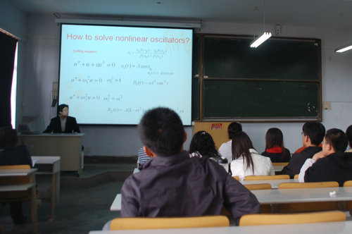 何吉欢教授的报告内容包括:应用中国古代数学和现代数学的基本思想或基本概念求解各种非线性方程;他主要介绍了变分方法、变分迭算法、参数展开方法和指数函数法在求解孤波解中的一些奇巧以及分数阶导数和分形导数的物理意义和差分—微分方程的应用。