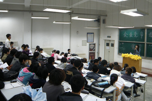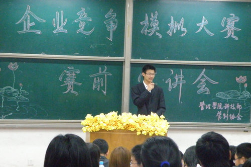 赵亮同学讲解了生产方面的问题,他指出,生产安排是大赛最重要的一个环节,他详细地向同学们介绍了人才调配、资源管理和财务报表等问题。张红介绍了市场的作用、职能,价格定位与产品质量的关系,建议同学们应该多了解对手以及前几期的市场变动,以便将自己的市场更加完善。接下来,刘刚同学介绍了销售战略,郝言明同学对产品选择、结构以及机器购买进行了非常细致独到的讲解。同学们聚精会神地听讲,并认真做笔记,此次宣讲会在同学们的掌声中圆满落幕。
