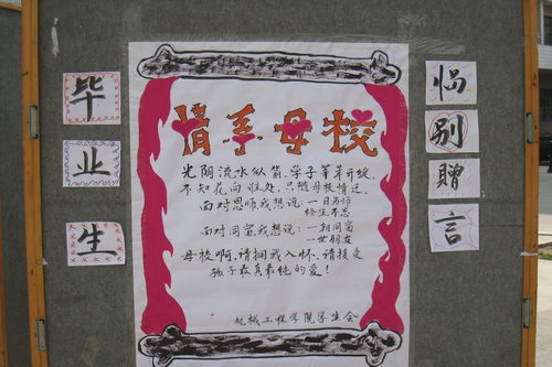 短短谏言,悠悠母校情;句句话语,勿忘授业恩。他们的感受,为在校大二、大三学生指明了学习的方向。通过此次活动,再一次让我们见识到了理工学子虽然要离开母校,但不忘恩师,情系母校的理工精神。为方便大家观看,展板将在一教大厅展览一周。(机械学院 李春生)