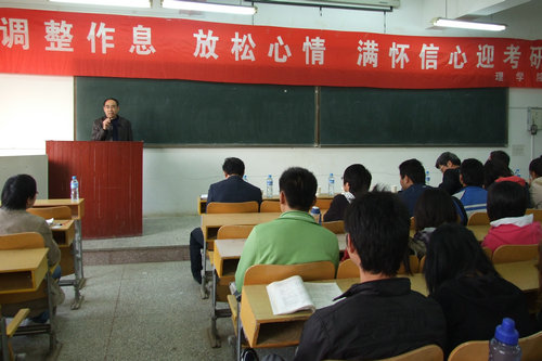 校长助理朱申红对理学院在教育教学工作中所付出的努力给予充分肯定,对隋允康先生的指导表示感谢。他希望考研的同学把考上研究生既看作在理工大学学习的结点,也是求学更高的一个新起点;08级同学要以学哥学姐们为榜样,汲取经验,尽快树立起自己的目标,争取取得比他们更好的成绩,并预祝考研学生成功。