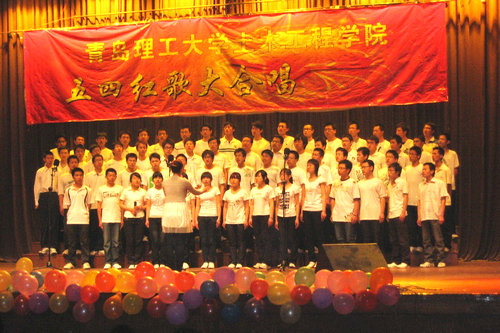 比赛之前,全体到场人员起立为玉树地震中遇难的同胞默哀1分钟,同时为玉树祈福。接下来各参赛队依次出场,本次比赛共有来自土木08级18个班级9个代表队参赛,比赛曲目有《我的中国心》、《精忠报国》、《黄河大合唱》等,各代表队歌声整齐洪亮,激情昂扬,用阵阵歌声传达着大家高涨的爱国主义情怀,传达着我们对玉树灾区的牵挂和对五四青年运动的纪念。