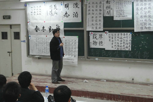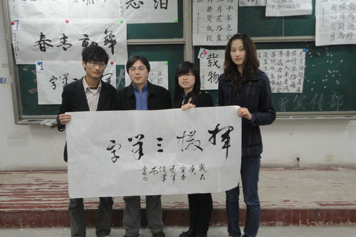 在一首动听的琵琶演奏开场后,各参赛队伍先后进行了粉笔字,钢笔字,毛笔字比赛。伴随着悠扬的古典乐曲,参赛选手们挥毫泼墨,书写了一幅幅字体各异、各具韵味的精美书法作品,显示了同学们深厚的书法功底。赵远军老师现场给选手的书法做出详细的评析,并亲自演示了各种字体的写法。经过激烈角逐,人文学院、商学院获得团体一等奖;个人奖项硬笔奖、毛笔奖、粉笔奖则分别由商学院王乐同学与计算机学院王延广同学摘得。比赛最后,赵远军老师题字“挥毫三笔字”赠送。