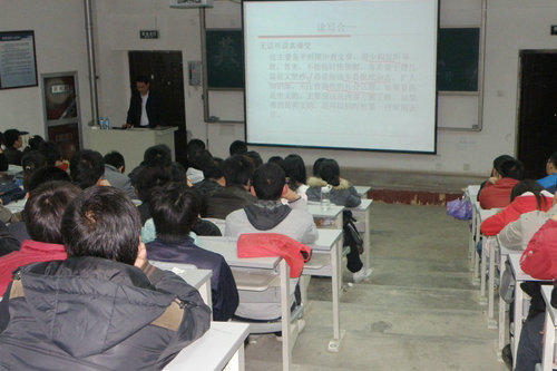 为了让同学们对英语四六级考试有更充分的认识,改善同学们备考过程中的学习方法,提高同学们英语水平,管理学院学生会学术部于4月21日晚7点在2教阶303教室举办了英语四六级讲座,外国语学院的冯志国老师应邀作讲座。