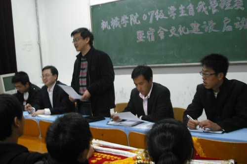 4月19日下午4:30,机械学院07级学生自管委员会成立曁宿舍文化建设中期检查在机械红楼308顺利举行。出席此次会议的有机械学院党总支副书记肖学斌、团总支书记贺治成、辅导员张建军及自管委员会成员等。