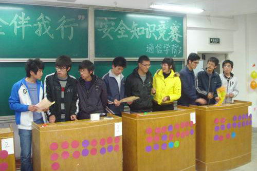 4月18日晚7点,通信学院以“安全伴我行”为主题的知识竞赛在阶教202成功举办。本活动通过各种形式的互动问答,旨在加深同学们对安全知识的了解,并提高对自身的保护能力。参赛的五支队伍分别由通信学院09级各班的三名同学组成。