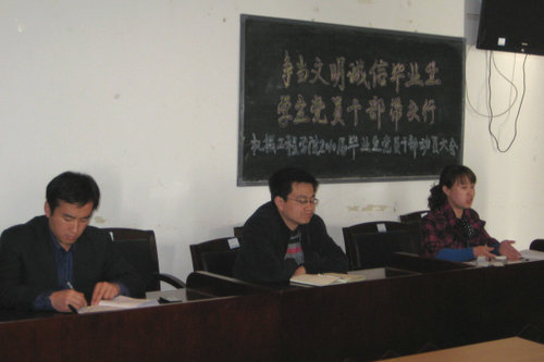 4月9日下午4点,机械学院在3教416召开以“争当文明诚信毕业生,学生党员干部带头行”为主题的2010届毕业生党员干部动员大会。党总支副书记肖学斌、06级辅导员柳超老师出席会议,06级全体学生党员、干部参加大会。会议由团总支书记贺治成主持。