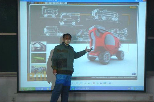 隋老师简短且精彩的开场白为此次活动拉开了帷幕。刘晓斌副院长借助多媒体教学设施,为同学们播放了了历届大赛获奖作品的照片。其中包括:极大减轻了消防员工作强度的“水麒麟”;美观大方的“路人甲”,更有由京剧脸谱演变而来的“萃”,外表透露出一股股浓烈的中国风。一款款设计新颖而别致的的汽车,令在场同学为设计者的想象力而折服。刘晓斌副院长强调:查找资料,草拟初稿和完善终稿是汽车设计的的三个阶段,并鼓励同学们大胆想象,合理设计,并在适当时机寻求与别人的合作。