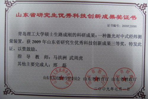路成刚同学发明的改进型普通光学经纬仪于2008年12月份成功获得一项国家专利。该项专利是由教务处副处长马洪洲教授指导,经过多次反复的实验和改造,在普通经纬仪上增设了激光瞄准、对中、照明装置,从而大大提高了普通光学经纬仪的工作效率。