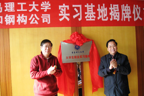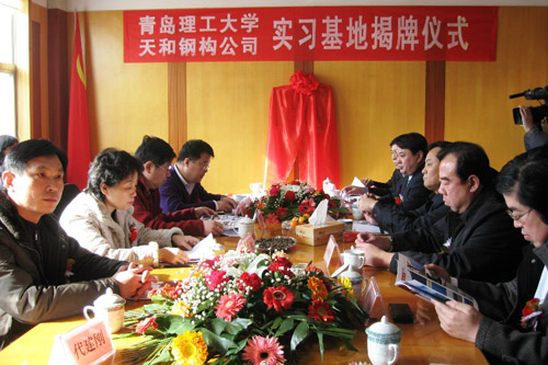 土木学院党总支书记刘健和平度市政协主席王学海一起为就业基地揭牌。座谈会后,大家一起参观了天和钢结构建筑有限公司的生产厂房和车间。