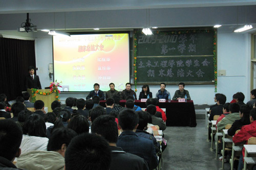 为及时总结学生工作经验,提高工作效率,确保下学期学生工作顺利开展,土木学院学生会于近日召开了2009-2010学年第一学期期末总结大会。土木学院党总支副书记宋玲、辅导员张继清、邵先锋、张立伟老师,建筑学院、环境学院、机械学院学生会主席以及土木学院学生会全体成员出席了总结大会。