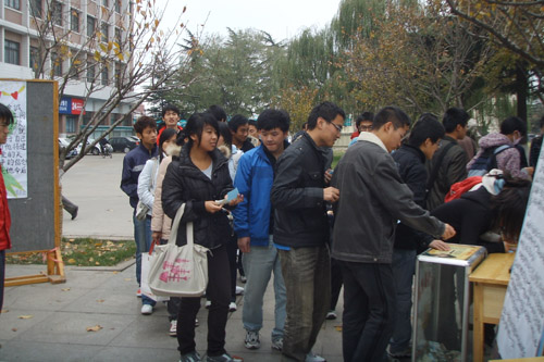 11月24日,即募捐第一天,爱心募捐小组早早的到达了指定地点,轮流换班为初阳同学筹集善款。凛冽的寒风吹不灭他们心中的希望之火;寒冷的天气冻不掉他们对初阳同学的爱恋。他们向每一个过来捐款的老师、同学表示深深的感谢,每一次弯腰,表达不尽他们对募捐者的无限感激;每一声“谢谢”,都表达不尽他们对爱心人士最诚挚的谢意,传达不尽他们对初阳同学的无尽祝福。全校同学纷纷献出爱心,很多学生以宿舍为单位,捐出了积攒下的零用钱,一些班级也纷纷开班会响应,为初阳同学奉献一份爱心。机械学院07级各班级、校学生会、校社团联合会,各学院老师、同学纷纷捐款并写满祝福的纸条将无尽爱心奉上。25日,募捐活动继续,机械学院08级各班级,机械学院各位老师,过路的同学纷纷伸出友爱之手,为初阳同学贡献出自己的一份力量,他们用博爱的胸怀铸就人间真情,用奉献的行动创建生命的奇迹。
