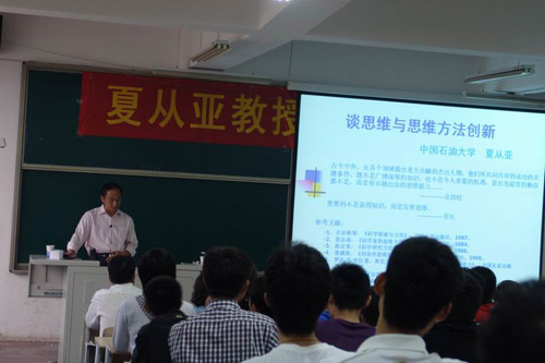 10月26日下午,应人文社科学院邀请,中国石油大学人文社会科学学院院长,博士生导师,马克思主义哲学学科学术带头人,山东省自然辩证法研究会副会长,省哲学学会哲学教学研究会常务理事、入选省、市社会科学人才库,山东省及青岛市社会科学优秀成果评奖委员会委员,同时被蒙古国国家科学院授予名誉博士夏从亚教授来到黄岛校区,在2教422举办了题为“创新思维的培养”学术报告会。人文社科学院院长谭业庭,党总支副书记林桂梅,200余名新生代表参加了本次报告会。谭业庭院长主持会议。
